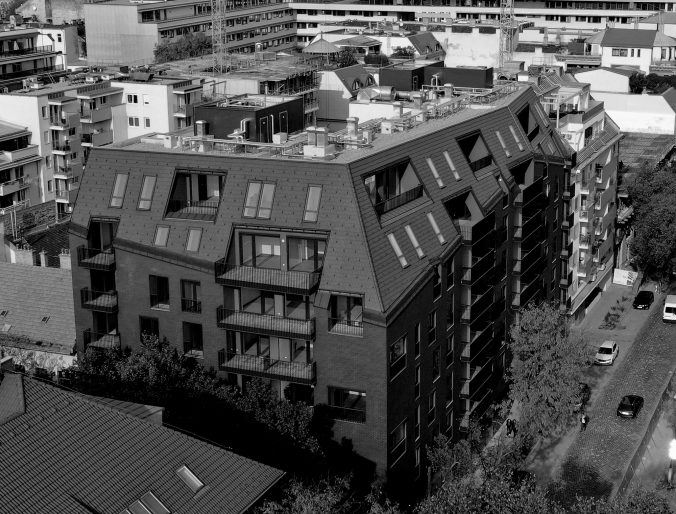 Westfalia társasház tervezés Budapest skandináv stílus korszerű épületgépészet trendi lobby élénk színek minimalizmus kortárs építészet cserépfedés téglaburkolat tetőterasz magastető penthouse